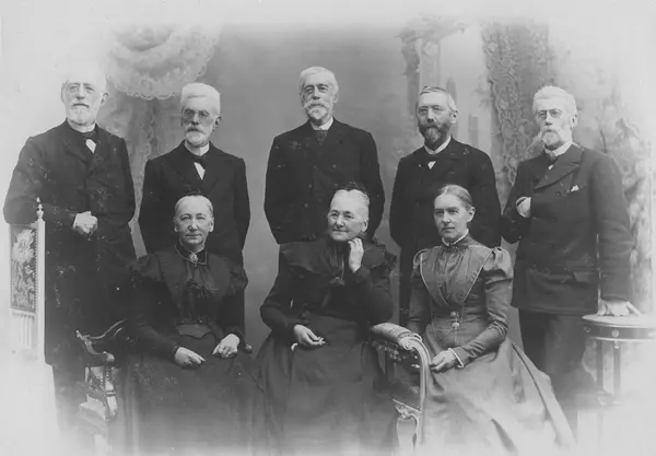 Bak fra venstre: Ulrik Frederik Vilhelm Boyesen Koren, August Laurentius Koren, Claus Gustav Myrin Koren, Wilhelm Frimann Koren, Paul Laurentius Stub Koren. Foran fra venstre: Elisabeth (Elisa) Anna Georgine Koren g.m. Hans Olsen, Aletta Wilhelmine Dorothea Koren g.m. Carl Anton Bjerknes, Petra Adelaide Sophie Koren g.m. Christian Magnus Holst.