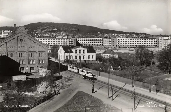 utsikt, vei, trikk, fabrikkbygning, Bjølsen valsemølle, bolighus, Sandakerbakken, Thor Olsens stiftelse, boligblokk Folkvang