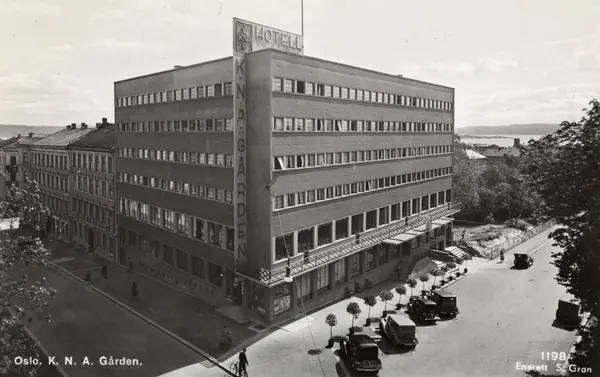 gateløp, K.N.A.-hotellet, biler, mennesker, bygårder