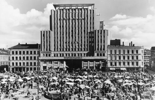 Folketeaterbygningen, Verdensteatret kino, kontorbygning, forretningsgårder, torg, mennesker, torghandel, fontene