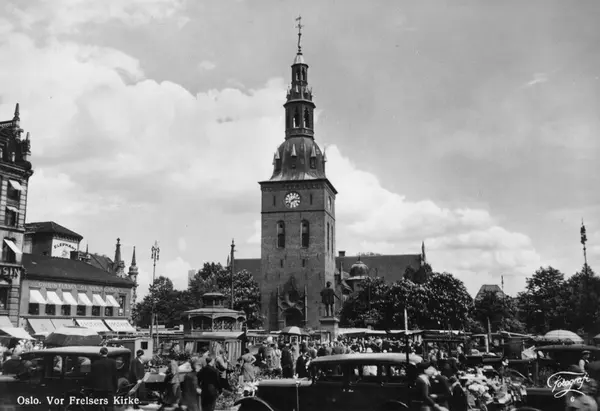 torg, torghandel, mennesker, biler, trikker, Vår Frelsers kirke, forretningsgårder, pissoir