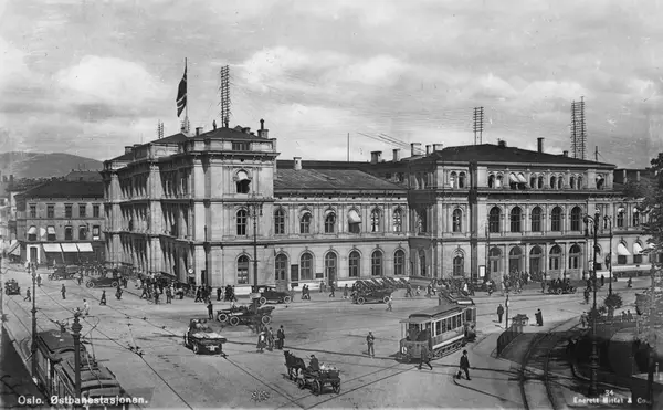 Østbanestasjonen, gateliv, trikker, biler, hestekjøretøyer, mennesker, forretningsgård