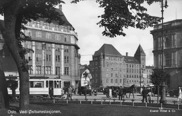 plass, park, forretningsgårder, Østbanestasjonen, gateliv, biler, trikk, hestekjøretøyer, mennesker
