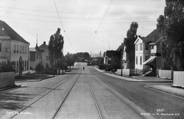 Grefsenveien med nr. 62 m/ markise. Bildet er tatt like ovenfor Bjerkealleen mot broen over jernbanen lengst nede (nåværende Storokrysset). Kjelsåsbanen åpnet i september 1934, bildet må være tatt etter det.