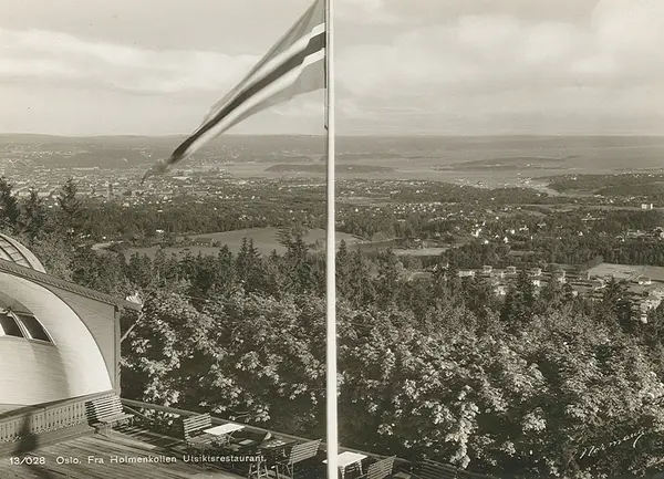 Holmenkollen restaurant, friluftsrestaurant, friluftsscene, vimpel, utsikt, skog, by, fjord