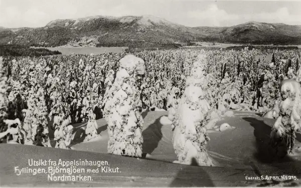Utsikt fra Appelsinhaugen. Fyllingen, Bjørnsjøen med Kikut, Nordmarken.