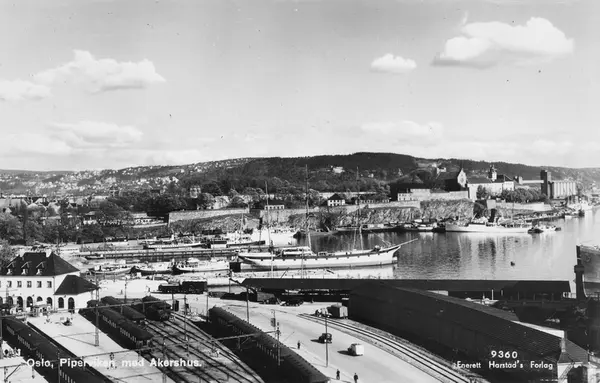 utsikt, Vestbanestasjonen, havn, seilskip Lingard, biler, mennesker, dampbåter, Skansen restaurant, Akershus festning