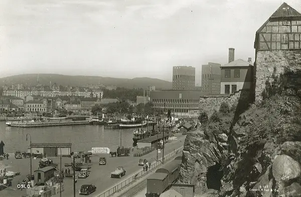 Akershus festning, utsikt, havn, vei, biler, jernbane, havnebanen, Rådhuset, vestbanestasjonen, bygårder