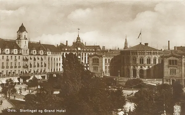 plass, park, gangveier, mennesker, Grand Hotel, Stortingsbygningen, forretningsgårder