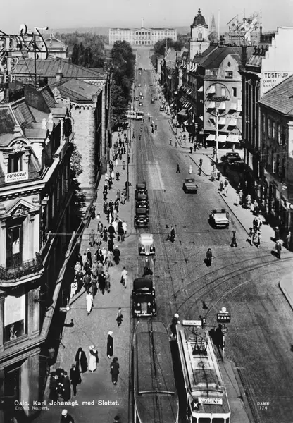 gateløp, biler, trikk, mennesker, gateliv, forretningsgårder, Stortingsbygningen, Grand Hotel, Slottet