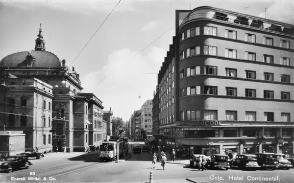 gateløp, Hotel Continental, Nationaltheatret, kontorbygninger, trikk, biler, mennesker, gateliv