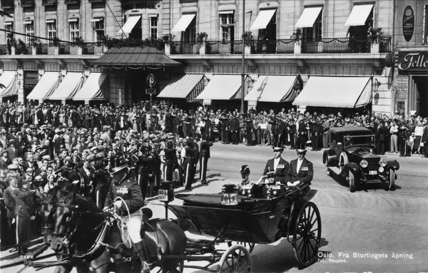 Stortingets åpning, hester, vogn, konge, kronprins, publikum, bil, Grand Hotel