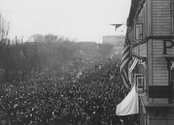 gateløp, hotell, amerikansk flagg, 17. mai-feiring, 17. mai-tog, musikkorps, mennesker, Fritzners paviljong, Slottet