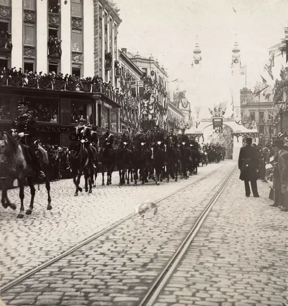 Oscar IIs regjeringsjubileum, gate, opptog, publikum, forretningsgårder, girlander, æresportal