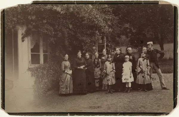 familien Ingiers landsted, gårdsplass, gruppe, kvinner, jenter, mann, stående helfigur