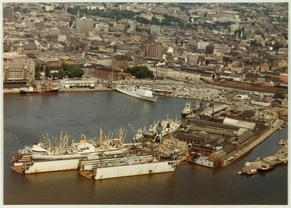 Nylands Verksted, skip, dokker, havn, Holger Danske, danskebåt, Østbanestasjonen, forretningsgårder, Hotell Viking, Oslo Domkirke, Oslo Havnelager