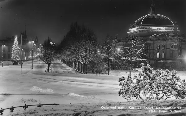 Oslo ved natt. Karl Johansgt. Nationalteatret.