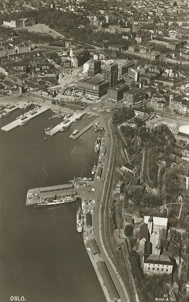 fjord, havn, Akershus festning, Rådhuset, Vestbanestarsjonen, forretningsgårder, kontorbygninger