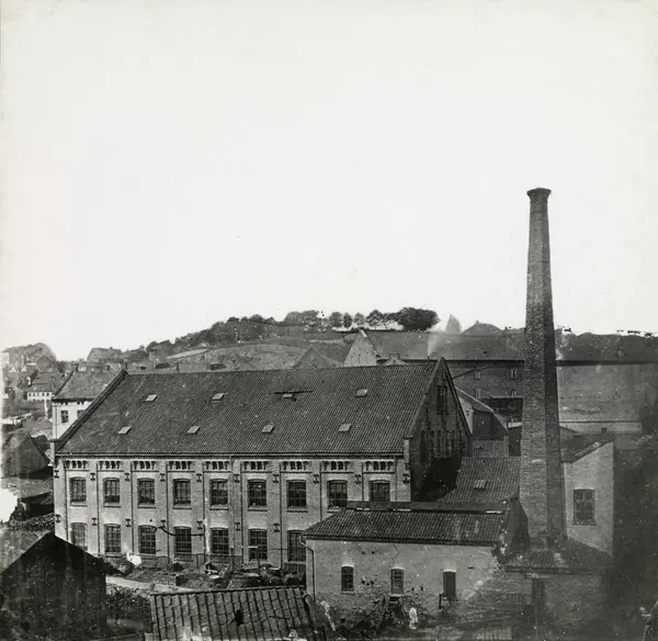 Kværner Brug med høyden der Vålerenga kirke og skole senere ble bygd. Taket på våningshuset på Vålerenga gård sees til venstre for fabrikkpipen.