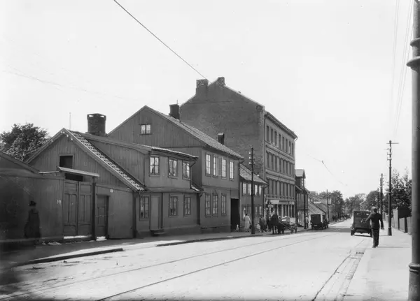 gateløp, trehusbebyggelse, bygårder, mennesker, bil, hest, vogn, trikkeskinner