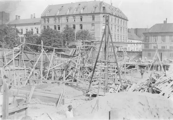 byggetomt, stillas, Norges Bank, bygningsarbeidere, forretningsgårder