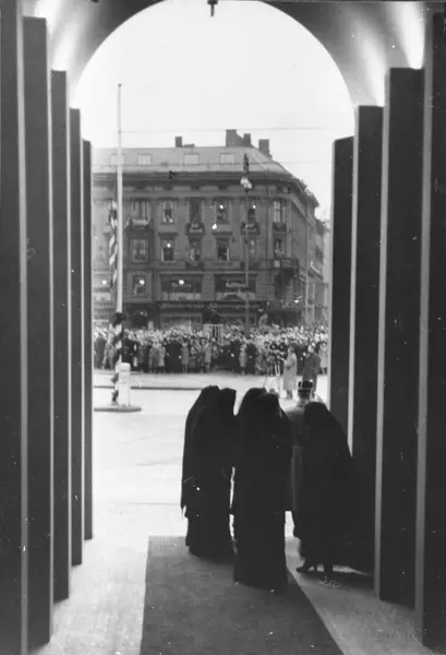 Dronning Mauds begravelse, Vår Frelsers kirke, forhall, kongelige kvinner, sørgeklær, slør, publikum, forretningsgård