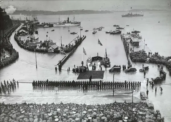 Dronning Mauds begravelse, honnørbryggen, skip, gardister, biler, publikum, regnvær, paraplyer