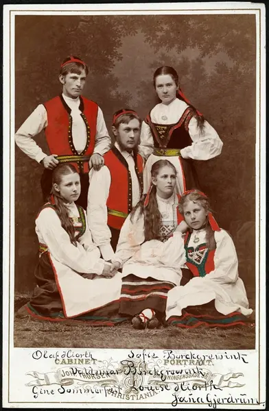 Bak fra venstre: Olaf Jørund Hiorth, Valdemar Borchgrevink, Sofie Borchgrevink. Foran fra venstre: Gine Sommerfelt, Louise Caroline Hiorth, Jana Gjerdrum.