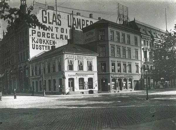 forretningsgårder, Elephant-Apotheket, Christiania Glasmagasin, gavlvegg, reklame