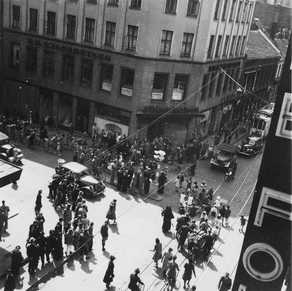 forretningsgårder, P.M. Engebretsen manufaktur, biler, trikk, mennesker, norsk trafikkpoliti, trikkeskinner