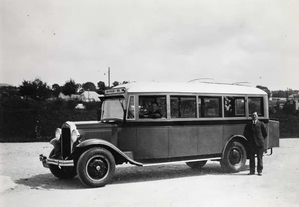 Reo årsmodell 1933-34. Det står Hurdalen - Dal st. i skiltkassen. Prøvenummeret på støtfangeren tyder på at bussen er helt ny og at dette er et leveransefoto.