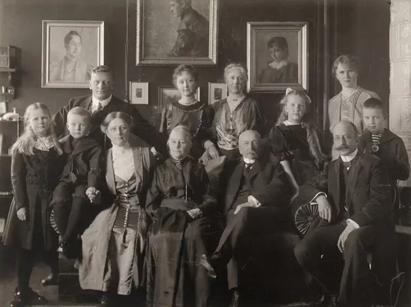 familiegruppe, menn, kvinner, gutter, jenter, gullbryllupsfeiring, stående og sittende knefigur