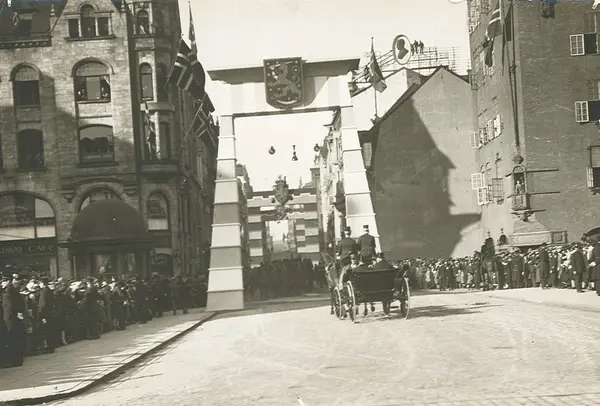 gateløp, æresportal, hestekjøretøy, menn, konge, president, mottagelse, offisielt besøk, forretningsgårder