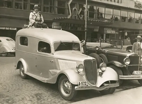 NRK's første reportasjebil A-572, "Lammers", oppkalt etter komponisten fordi bilen var sølvfarget. (Thorvald Lammers skrev "Sølvet det er seg så edelt et malm".) Ford 1934 med karosseri spesialbygget i Oslo av N. Jacobsens Karosserifabrikk, Oslo, trolig før flytting fra Lindemanns gate 9 til Nedre gate 5. Bilen til høyre, C-5170, er en Graham-Paige 1929 med eier Trygve Gran, Tyristua, Slependen.