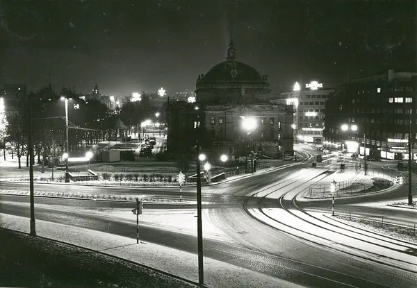 utsikt, gateløp, lyskryss, trafikklys, forretningsgårder, Nationaltheatret, Hotel Continental, nattemørke