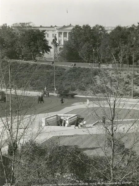Undergrundbanen. Nationaltheatret station med Abelmonumentet og Slottet.