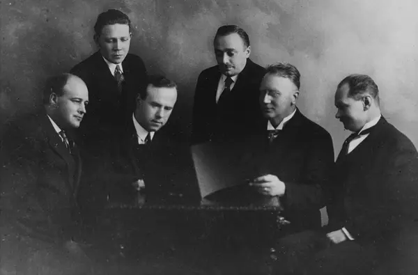 Foran fra venstre: bibliotekar Hansen, formann Balzersen, dirigent Russ, nestformann Sjøberg. Bak fra venstre: kasserer Ullerud, sekretær Olafsen