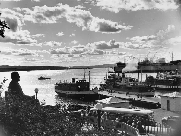 På utstikker A ligger M/S Oksvald til venstre og D/S Ursvik til høyre. På utstikker B ligger M/S Nesodtangen ytterst, og bak denne ligger M/S Drøbak. På vestsiden av utstikkeren ser vi det øverste av M/S Prinsen, som på dette tidspunkt var temmelig nøyaktig et halvt år gammel.