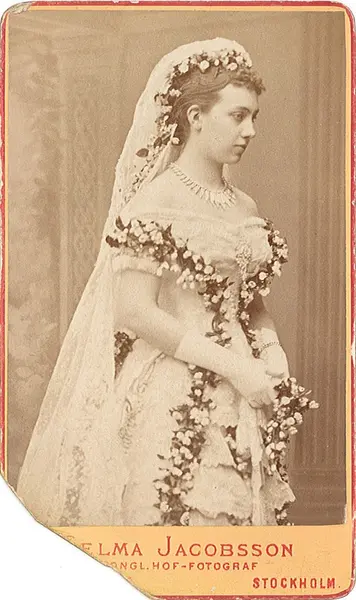 Prinsessan Sofia Maria VICTORIA av Baden i bruddräkt inför vigseln den 20 september 1881 med Sveriges dåvarande kronprins Gustaf, senare kung Gustaf V.