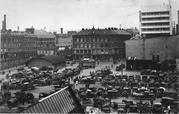 Grønlands torg, grønnsakhandel, mennesker, biler, hester, vogner, bygårder