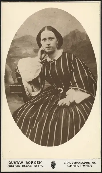 På baksiden: "Helga Margrethe Charlotte Dahl, født Anker. F. i Drøbak 12/10 1842. D. i Oslo 24/6 1928. Datter af kaptein John Collett Anker og hustru Thora Dorothea Wang. Gift i Fredrikstad 20/1 1860 med direktør af den høiere landbrugsskole paa Aas, Frederik August Dahl. 10 barn, hvoribl. sønnen major John Collett Anker Dahl."