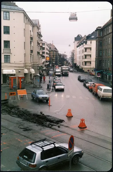gatekryss, anleggsarbeid, omlegging av trikkeskinner, biler, mennesker, bygårder, telefonkiosker