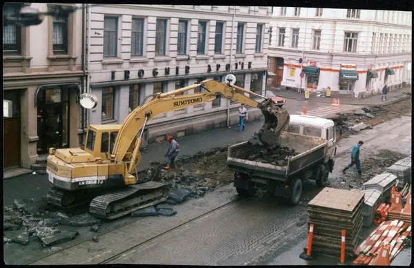 gateløp, anleggsarbeid, omlegging av trikkeskinner, Sumitomo gravemaskin, lastebil, menn, anleggsarbeidere, bygårder, Frogner apotek, snø