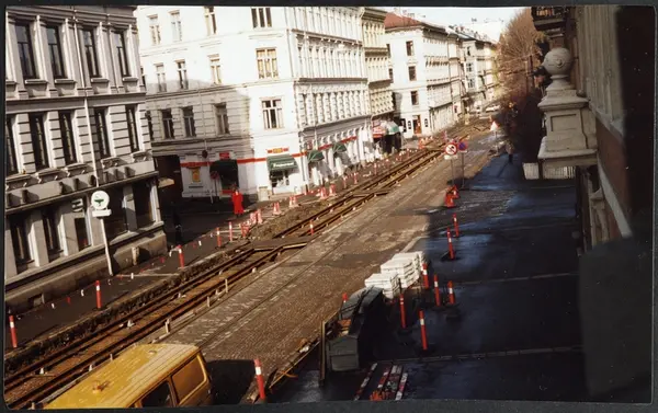 gateløp, anleggsarbeid, omlegging av trikkeskinner, sementbiler, bygårder, Frogner apotek