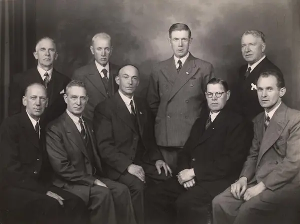 Foran fra venstre: H. Pedersen, viseformann I. Iversen, kasserer K. Ekmann, formann W. Borgersen og økonom A. Hansen. Bak fra venstre: F. Bystrøm, K. Julsrud, sekretær H. Hansen og E. Brodin.