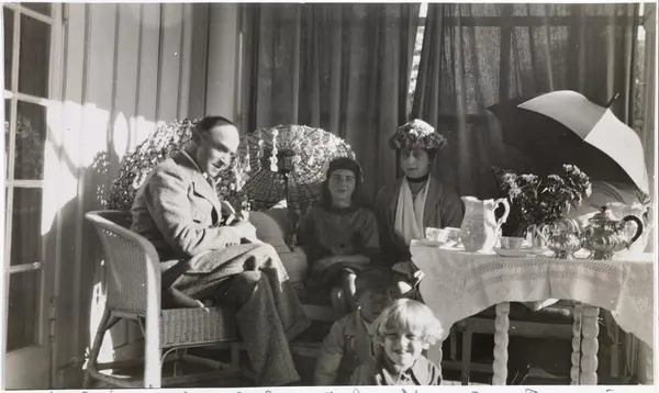 terrasse, hagemøbler, kvinne, dronning, mann, skuespiller, barn, kaffebord, parasoll