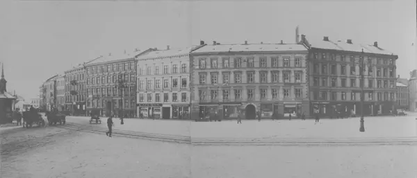 panorama, bygårder, forretninger, kaféer, hestekjøretøyer, mennesker, gateliv, kiosk, gatebelysning, snø