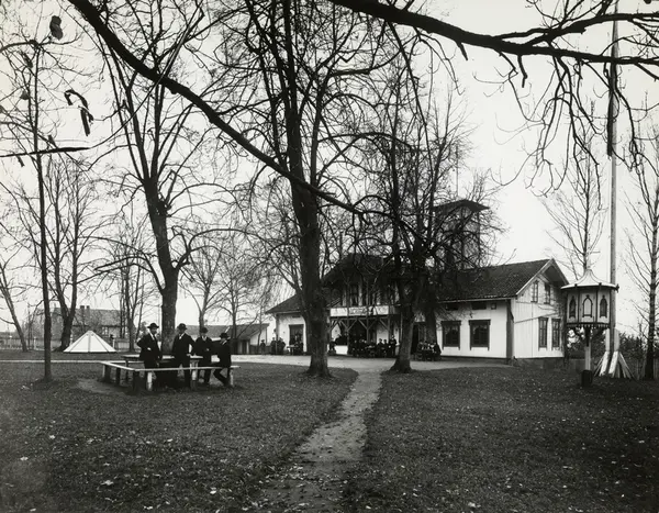 Jomfrubråtens café og restaurant, tun, kafébord, gjester, personale, dueslag
