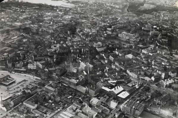 flyfoto, utsikt, by, torg, forretningsgårder, bygårder, elv, båter, kirker, Østbanestasjonen, Slottet, Victoria terrasse