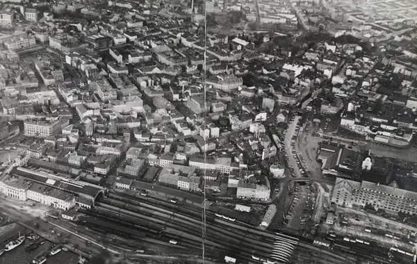 flyfoto, utsikt, by, Østbanestasjonen, sporområde, elv, båter, broer, forretningsgårder, bygårder